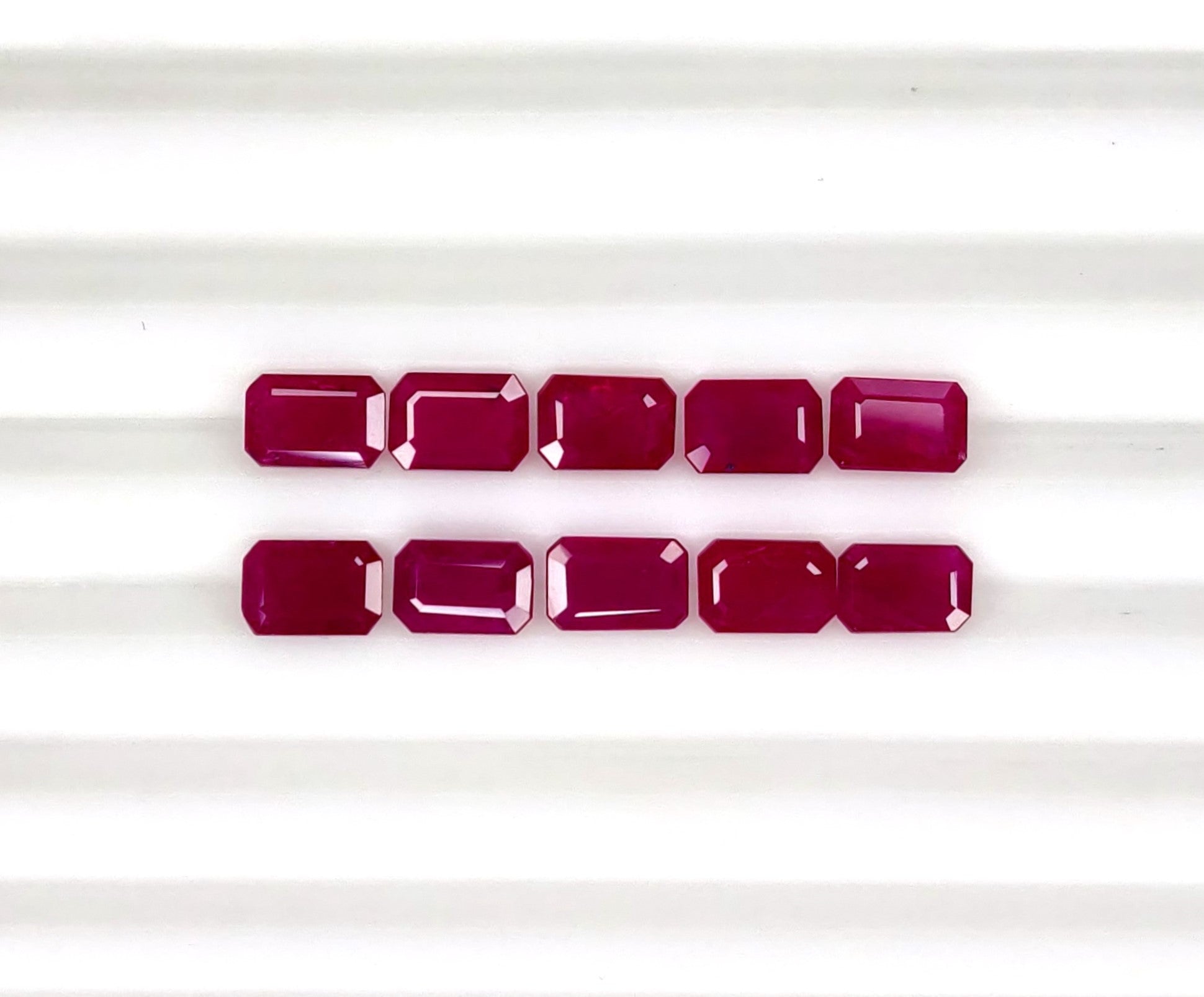 Gemstone: Natural RubyTreatment: HeatedOrigin: MozambiqueShape: OctagonSize: 6x4 mm Weight: 6.21 cts/10 pcsColor: C. Vivid RedQuality: 5. IncludedCertificate: Non-Certified