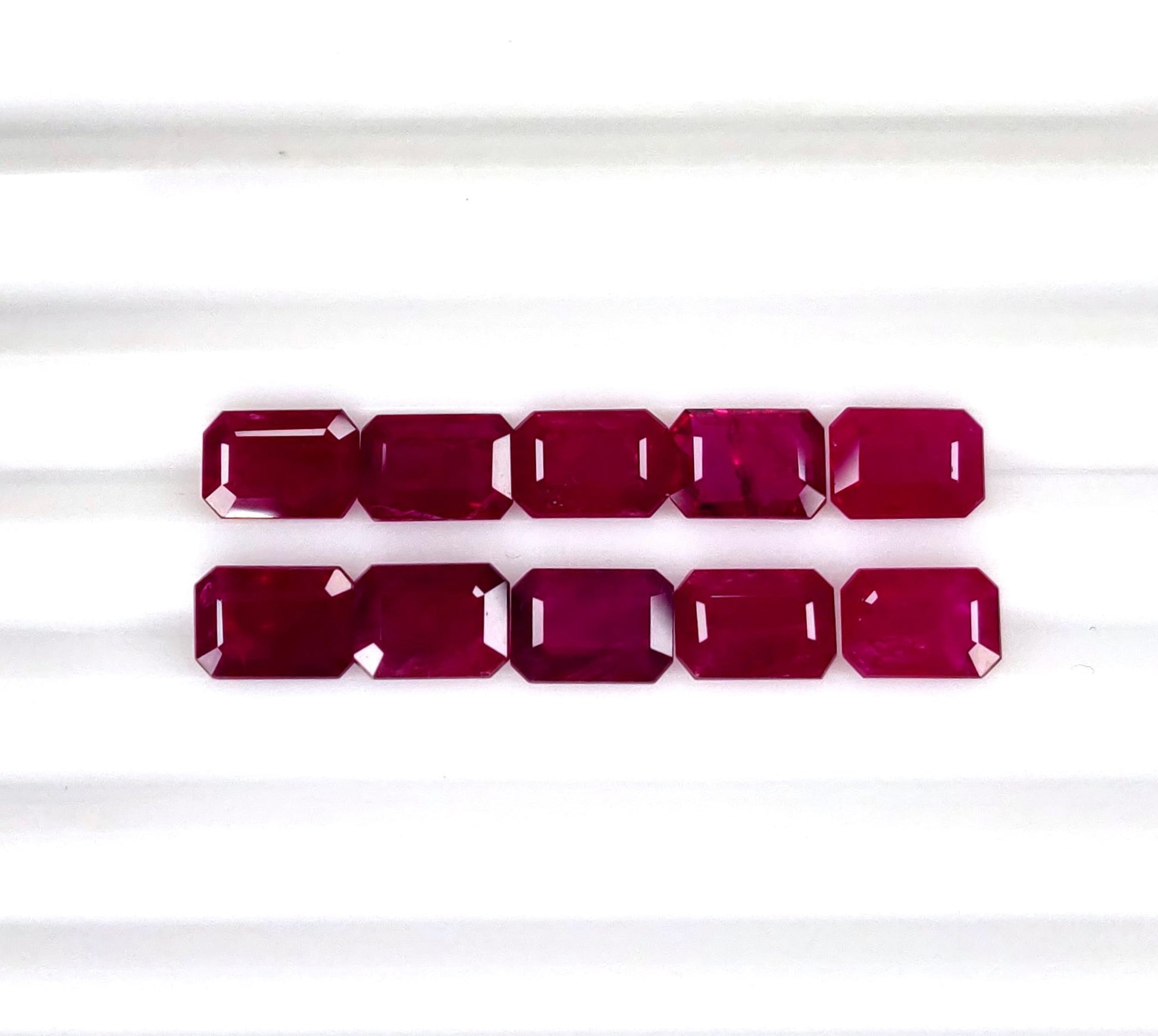 Gemstone: Natural RubyTreatment: HeatedOrigin: MozambiqueShape: OctagonSize: 7x5 mm Weight: 9.9 cts/10 pcsColor: B. Pigeon Blood RedQuality: 4. Moderate InclusionCertificate: Non-Certified