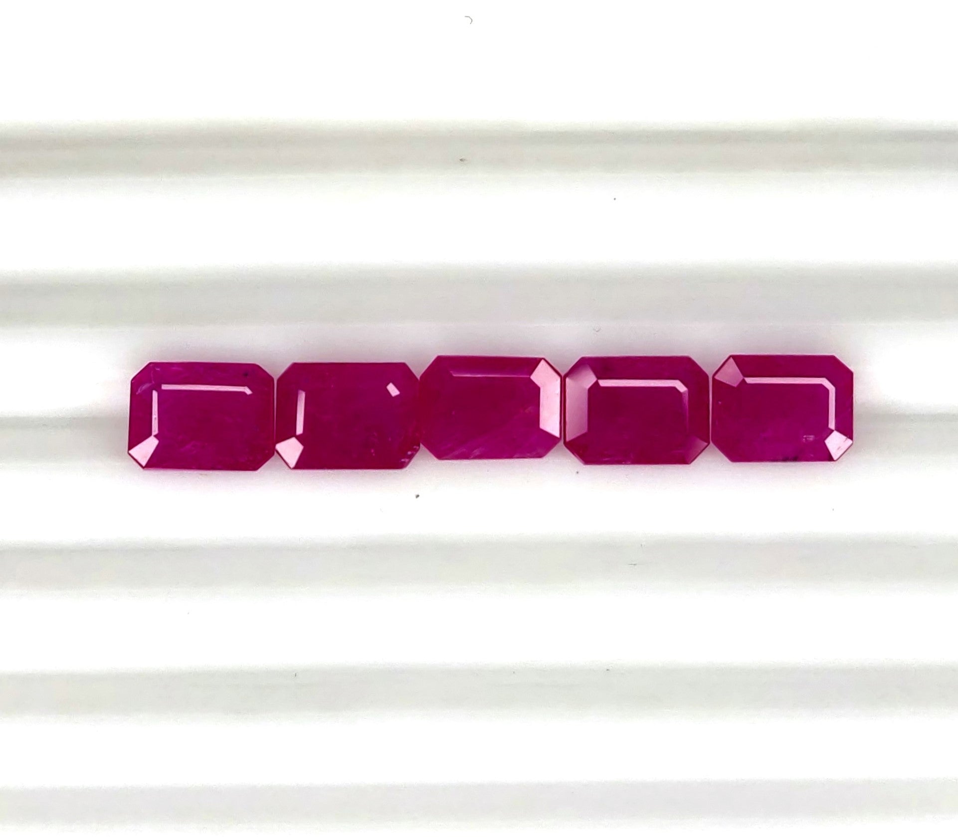 Gemstone: Natural RubyTreatment: HeatedOrigin: MozambiqueShape: OctagonSize: 8x6 mm Weight: 14.42 cts/10 pcsColor: D. Pinkish RedQuality: 4. Moderate InclusionCertificate: Non-Certified
