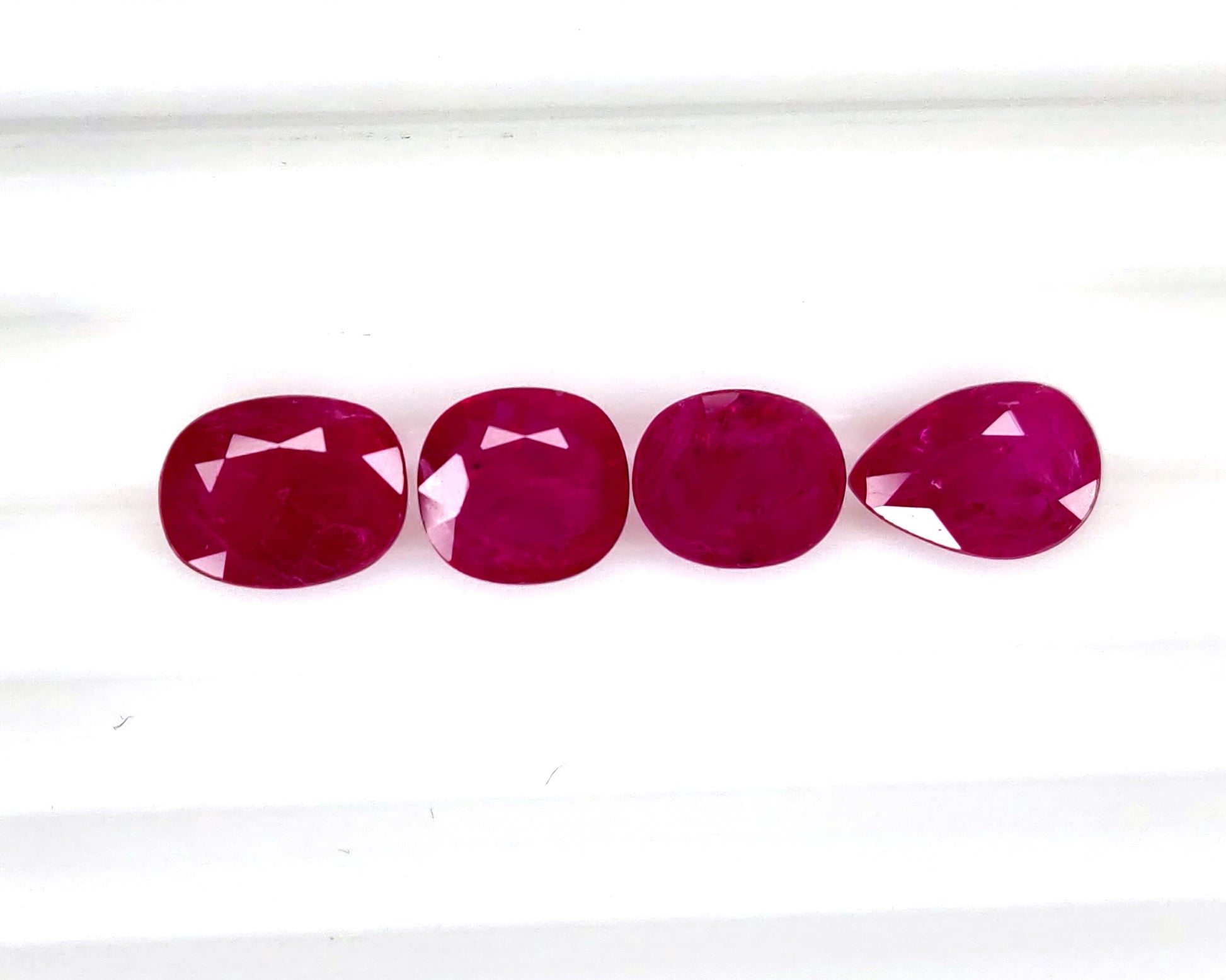 Gemstone: Natural RubyTreatment: HeatedOrigin: MozambiqueShape: OvalSize: ^6*8, 7*9Weight: 6.36 cts/4 pcsColor: C. Vivid RedQuality: Moderate Inclusion