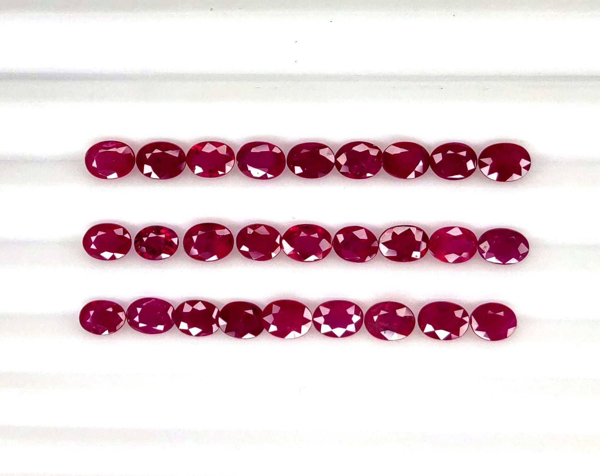 Gemstone: Natural RubyTreatment: HeatedOrigin: MozambiqueShape: OvalSize: 4x3 mm Weight: 6.31 cts/28 pcsColor: C. Vivid RedQuality: 5. IncludedCertificate: Non-Certified