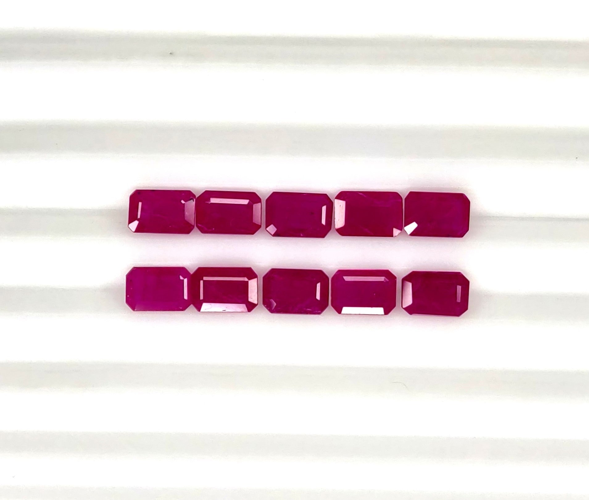 Gemstone: Natural RubyTreatment: HeatedOrigin: MozambiqueShape: OctagonSize: 6x4 mm Weight: 5.78 cts/10 pcsColor: D. Pinkish RedQuality: 5. IncludedCertificate: Non-Certified