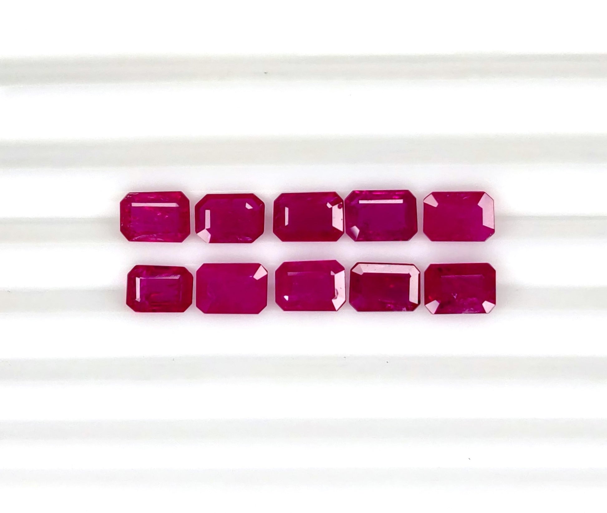 Gemstone: Natural RubyTreatment: HeatedOrigin: MozambiqueShape: OctagonSize: 7x5 mm Weight: 9.85 cts/10 pcsColor: C. Vivid RedQuality: 3. Slight InclusionCertificate: Non-Certified